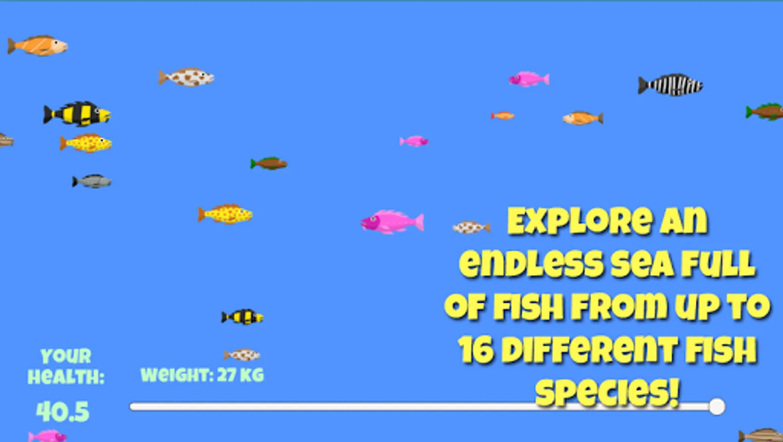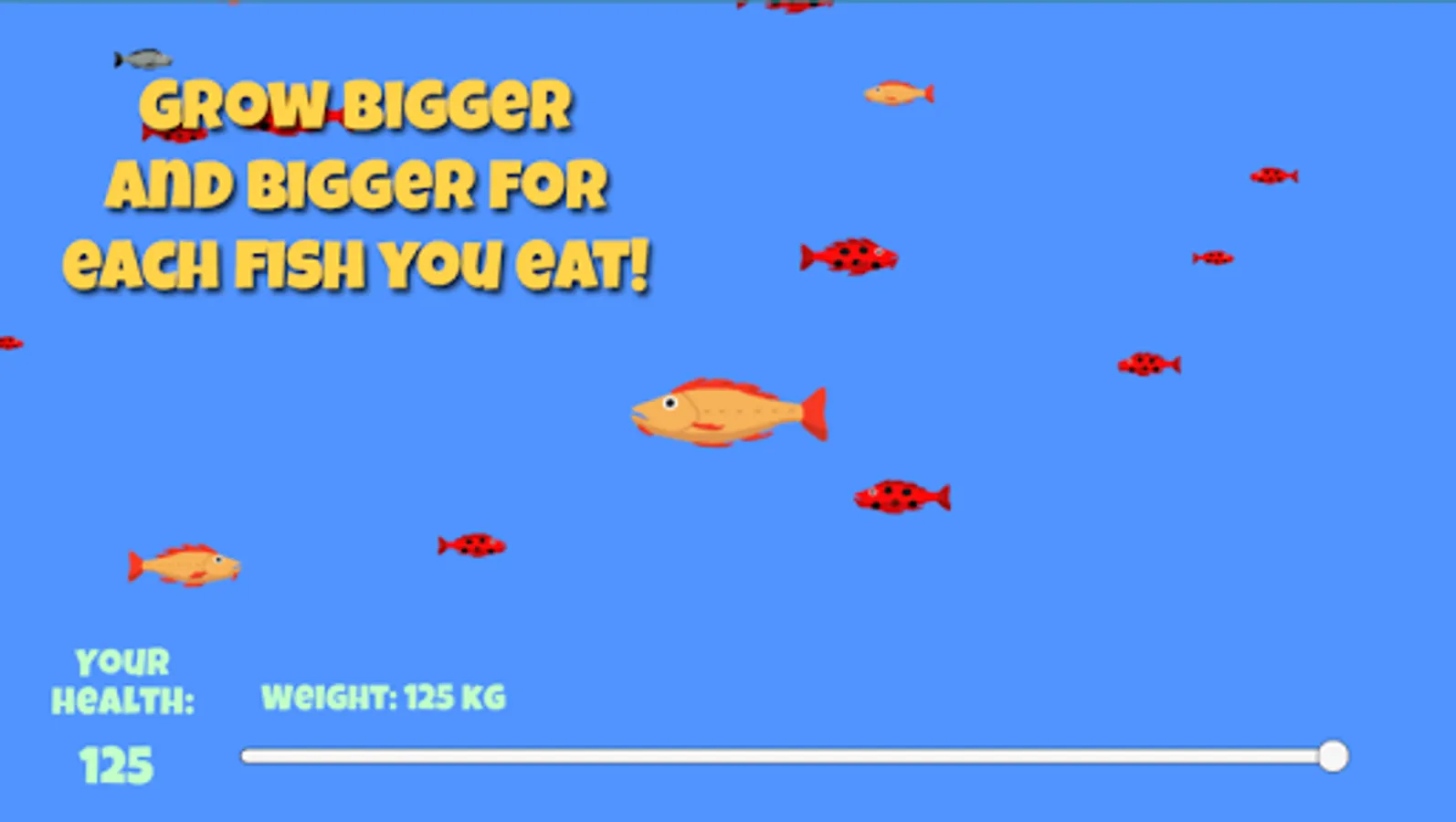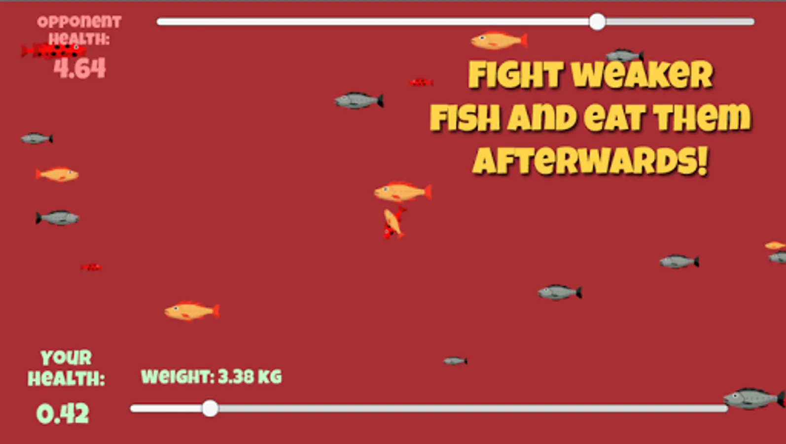 Your goal is to grow as big as you can. Fight fish that are smaller than you, but generally avoid the bigger ones, unless you think you can beat them (depends on your fish level). When you collide with another fish, the fish will start to tussle. They will tussle until one of them is dead, unless you manage to escape. If you win the tussle, you eat the other fish, grow a little bit, and get a nice health boost. If the other fish wins the tussle, it eats you, and it's game over. Harsh, yes, but that's what makes it so fun!