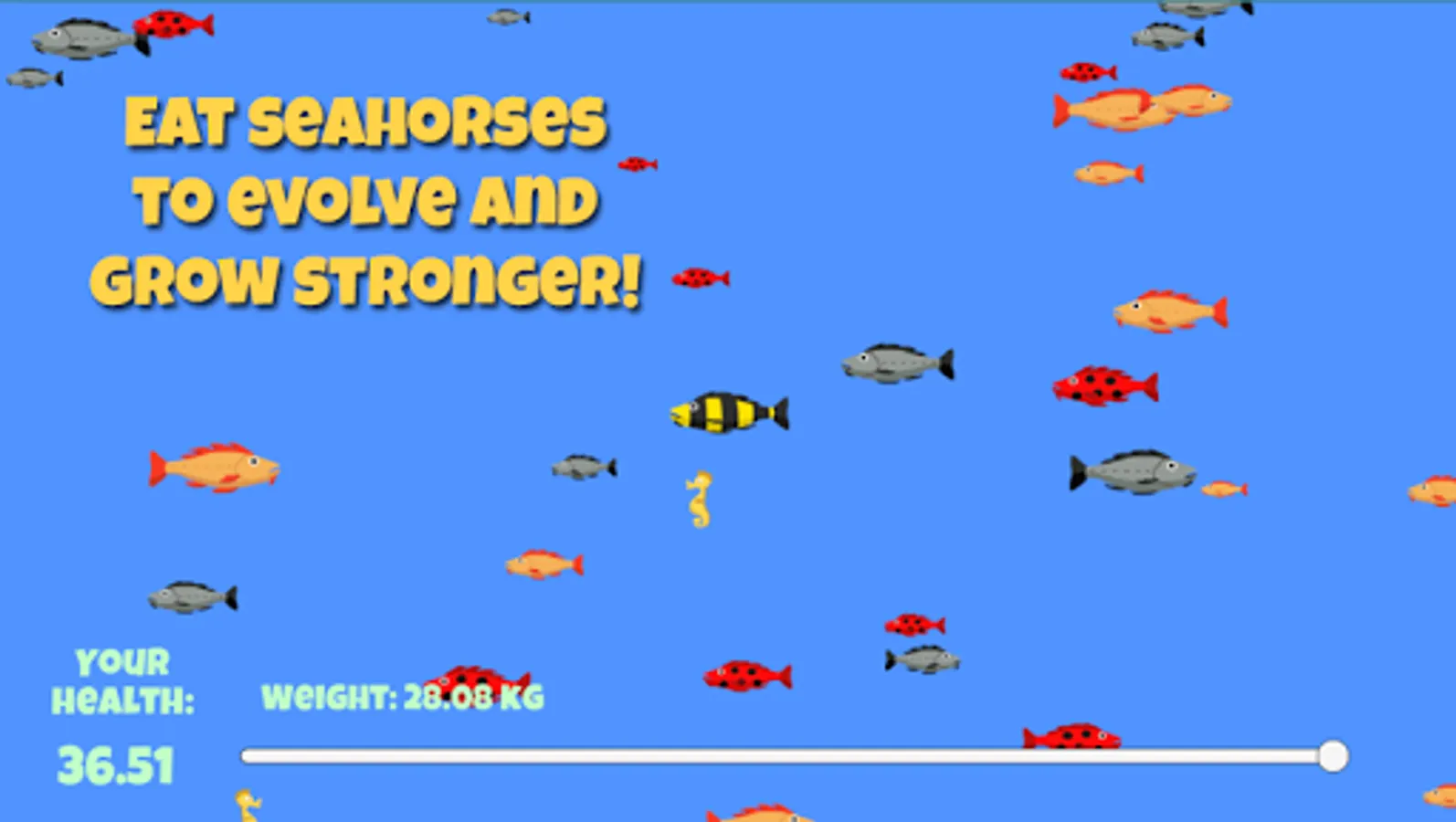 If you eat a lot of fish you grow bigger and bigger. You can also evolve your fish to the next level by eating a seahorse. Seahorses will appear randomly once in a while, so keep a lookout for them!
