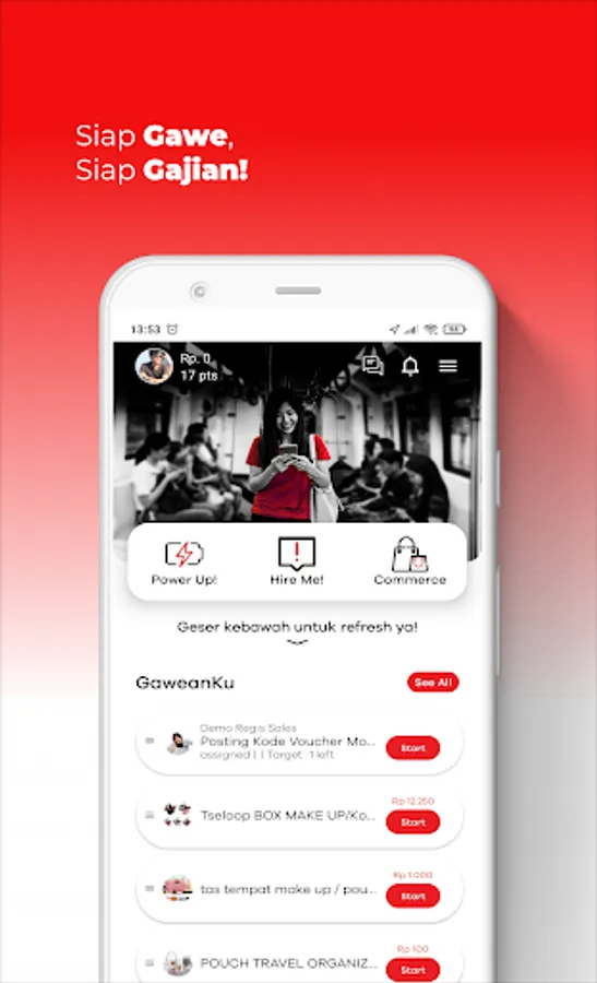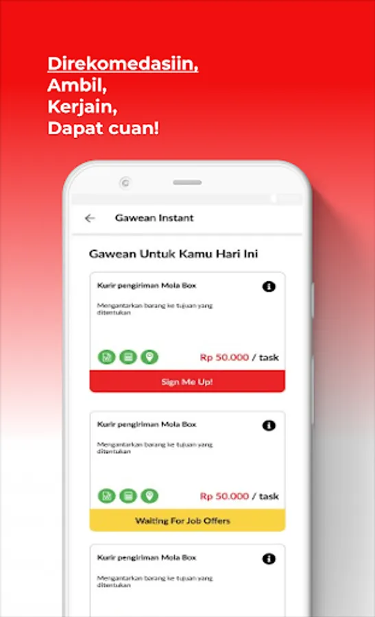 MoGawe menawarkan tugas-tugas (gawean) sederhana yang bisa dipilih terserah kamu. Dompet MoGawe kamu akan terus bertambah untuk setiap tugas yang bisa kamu selesaikan sesuai instruksi melalui aplikasi MoGawe