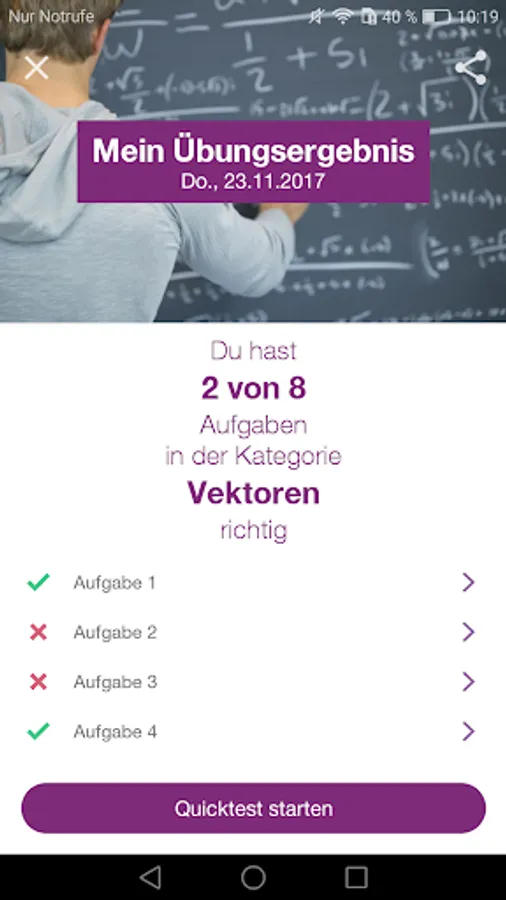 Regardless where you are right now, you can do a quiz your math exercises in form without paper and pencil. Learning for your exam you can not lose weight this app unfortunately. but it offers you an ideal complement so that you festigst the learned content and playfully repeating:
