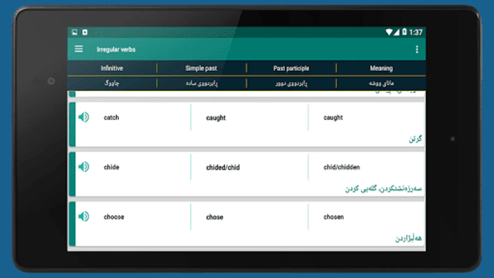 7. لیستێکی تەواوی فرمانە ناڕێکەکانی زمانی ئینگلیزی لەگەڵ مانای ووشەکان و خوێندنەوەی ووشەکان.