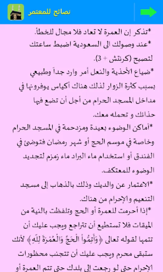 The application includes religious information and tips from pilgrims experiences according to Haj and Umrah to ensure the performance of his Umrah to the fullest, God willing, and can be used as a religious guide during Umrah trip it includes: