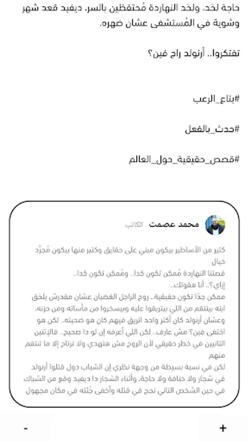 It is prepared and translated by the writer Mohamed Esmat, who is a distinguished young writer from Damietta Governorate specializing in writing horror and metaphors. , “Mengele”, “The Dark Side”, “The Curses Gate”, “Actually Happened”, “Already Happened 2”, “Actually Happened 3”, “No Director (translation)”, “I brought you in revenge” and “Needalan”. The work of writer Mohamed Esmat always tops the list of best sellers, as he has many translated stories (more than a thousand stories) that we read from together in this exclusive application.