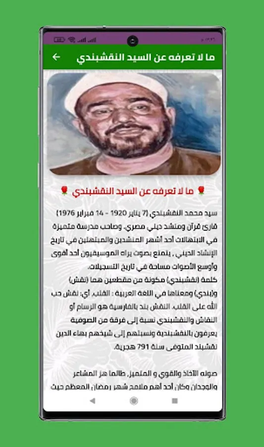 Sheikh Sayed Muhammad al-Naqshbandi, a professor of praisers, and the owner of a distinguished school in supplications, one of the most famous and reverent singers in the history of religious chanting. He has a voice that musicians see as one of the strongest and broadest voices in the history of recordings.