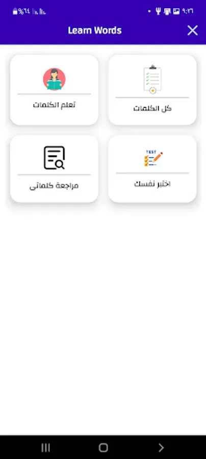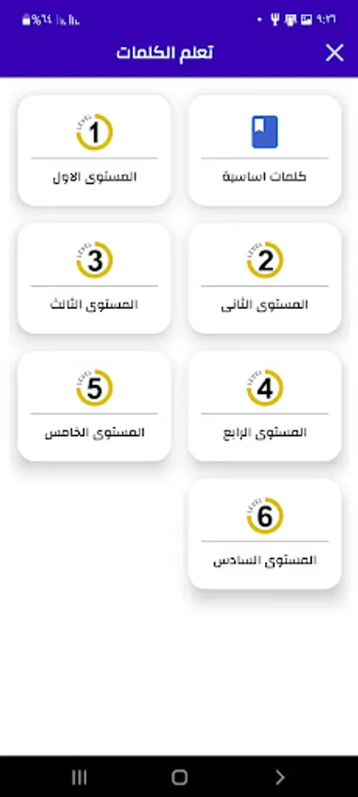 The application contains six levels to teach English words daily, including tests for each stage and language learning