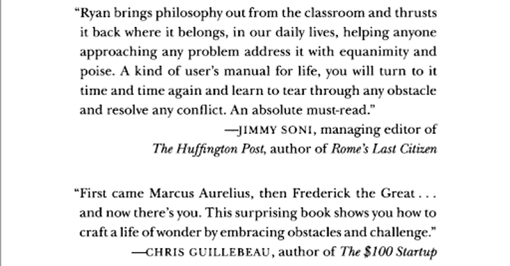 The Obstacle Is the Way Its many fans include a former governor and movie star (Arnold Schwarzenegger), a hip hop icon (LL Cool J), an Irish tennis pro (James McGee), an NBC sportscaster (Michele Tafoya), and the coaches and players of winning teams like the New England Patriots,