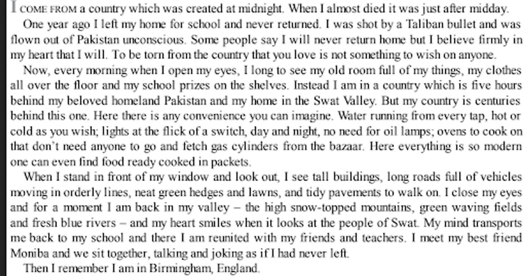 I am Malala is an autobiographical book by Malala Yousafzai, co-written with Christina Lamb. It was published on 8 October 2013