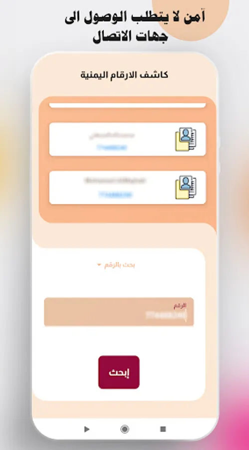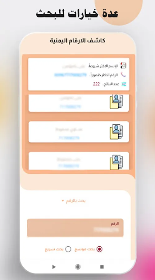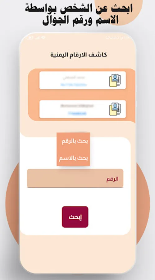The new Yemeni numbers detector program, the best application in knowing the identity or number of a person by searching for him by his name or number for free and without ads, through the application you can search for any Yemeni mobile number and it will show you all the names registered for this number, or you can search by the name of the person and you will It shows you most of the common numbers for this name, the application contains a database of millions of names for all Yemeni mobile networks (Yemen Mobile, MTN, Sabafon, and Wi).