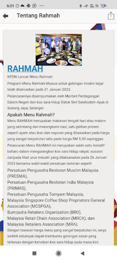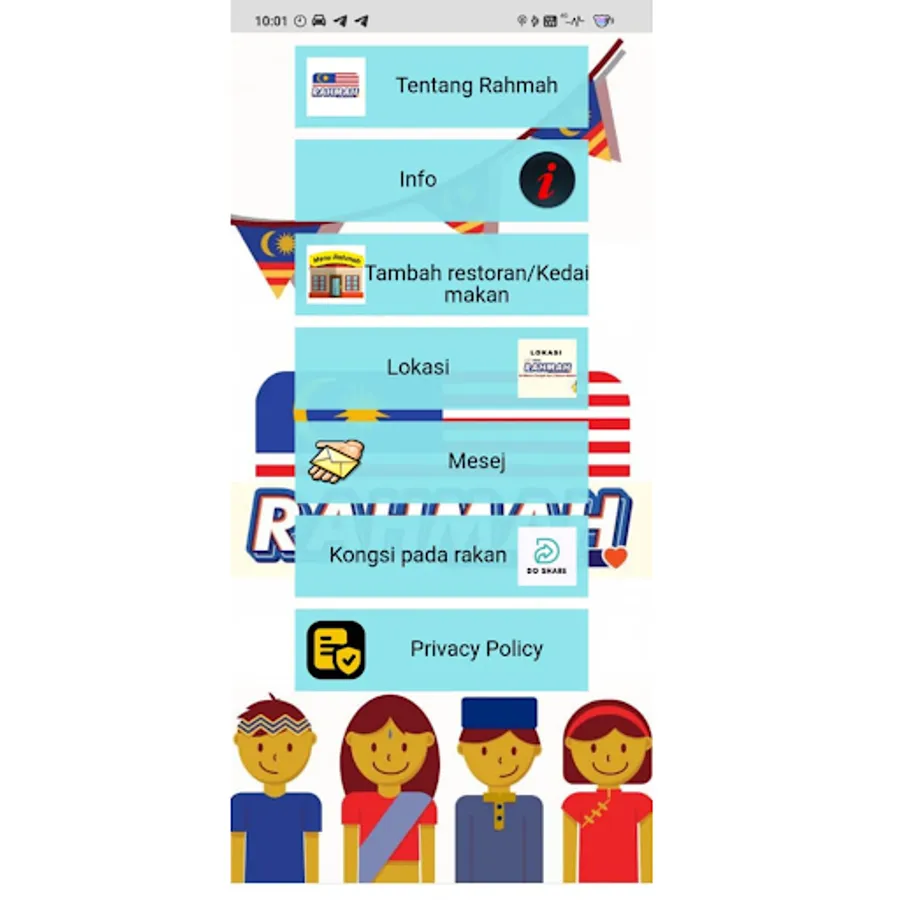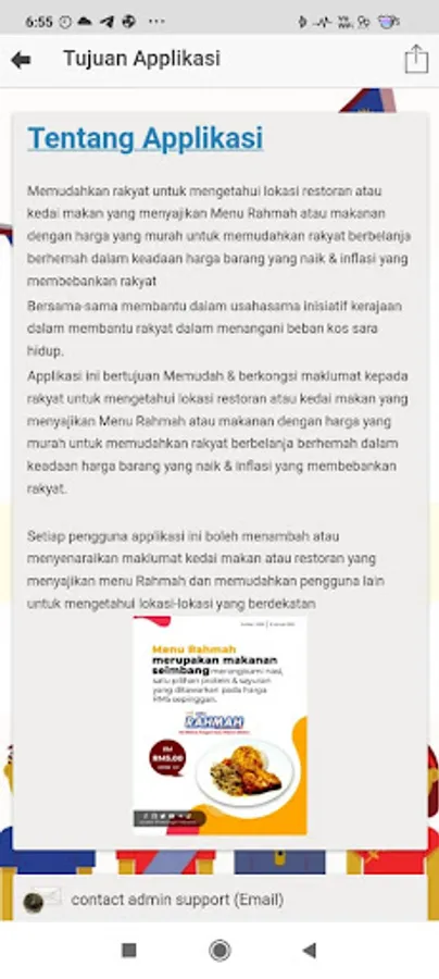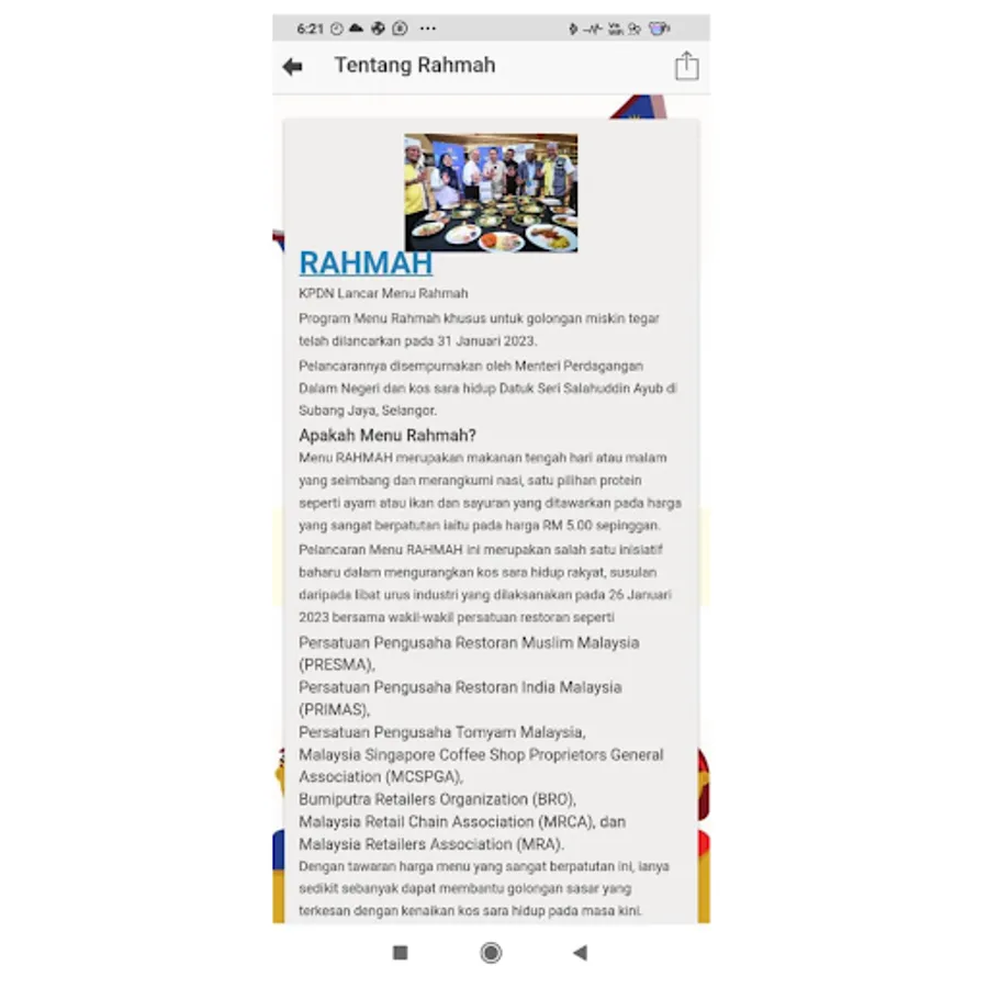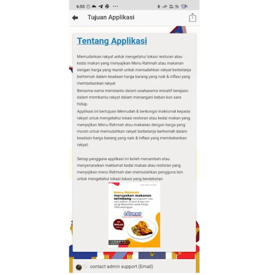 Applikasi ini bertujuan Memudah & berkongsi maklumat kepada rakyat untuk mengetahui lokasi restoran atau kedai makan yang menyajikan Menu Rahmah atau makanan dengan harga yang murah untuk memudahkan rakyat berbelanja berhemah dalam keadaan harga barang yang naik & inflasi yang membebankan rakyat.