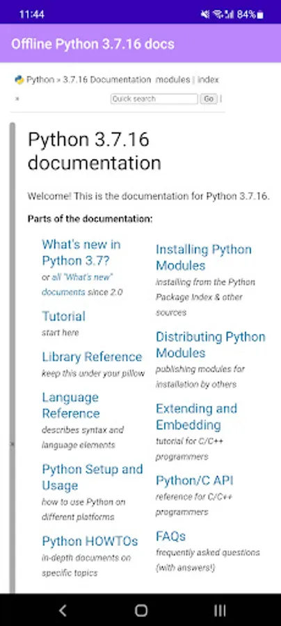 This app is an offline documentation for Google-Android OS. Imagine Python the complete HTML offline version at your mobile device and available to all.