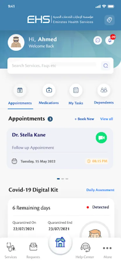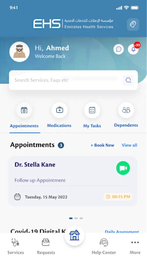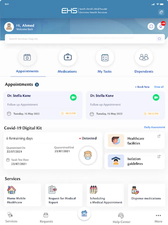 EHS App provide secure access to various patient services i.e. Appointment Booking, Medical Report request, Medicine Dispense, Home Mobile Care, Queue Management, Blood Donation request. The application employs a full-scale integration with our health care information systems i.e. WAREED, which centrally connects EHS’s medical facilities in-order to cater user needs and obtain up-to-date Medical Records, and Clinical Information. App users may also integrate with their wearable devices to obtain the basic vitals.