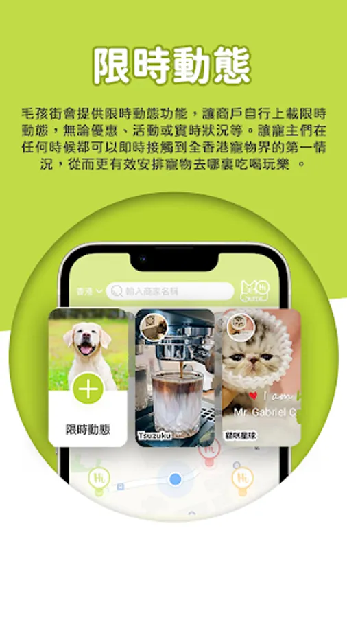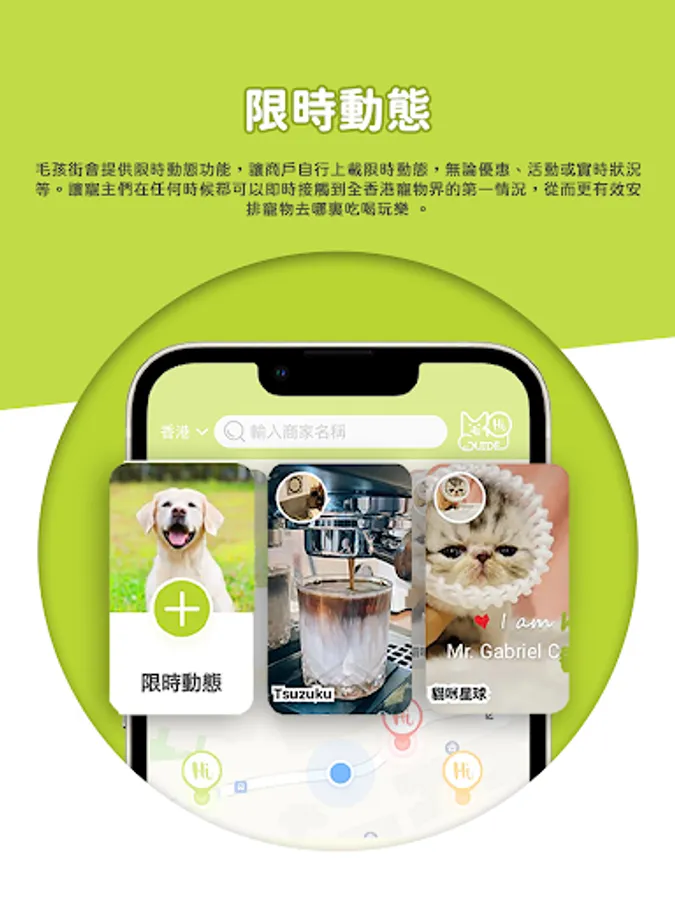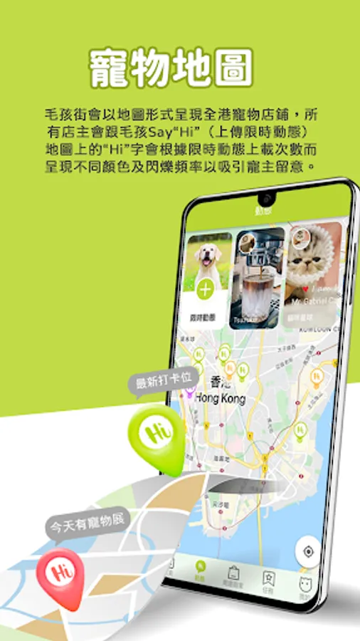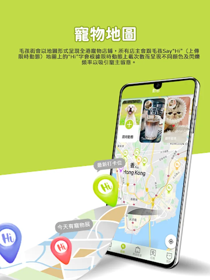 Mao Kid Street will present all pet shops in Hong Kong in the form of a map. All shop owners will say "Hi" to Mao Kid (upload limited-time dynamic). The word "Hi" on the map will show different colors and flashing frequencies according to the number of dynamic uploads within a limited time to attract pet owners. pay attention to.
