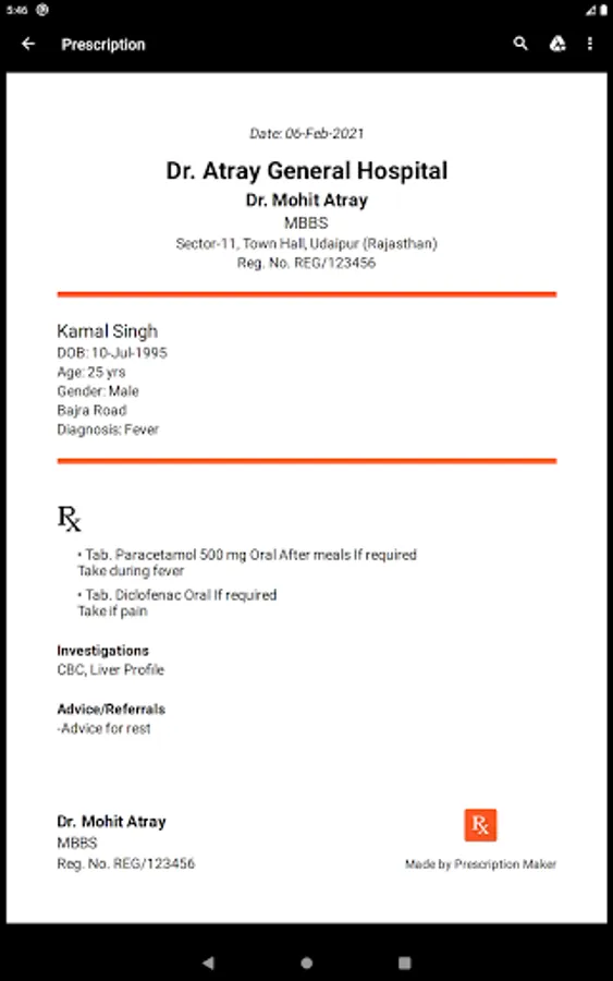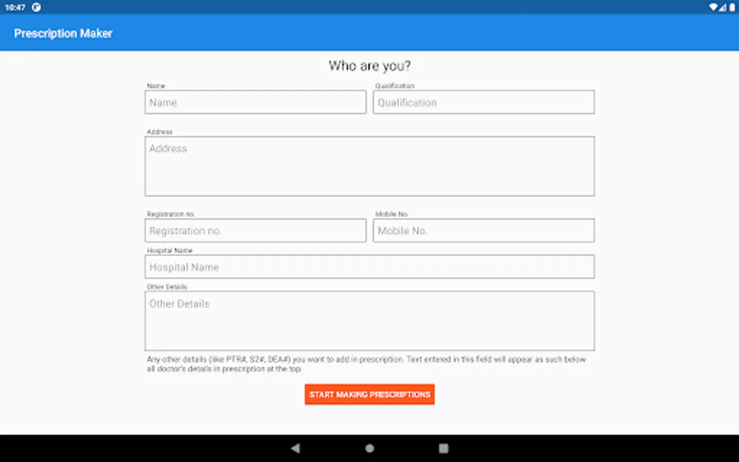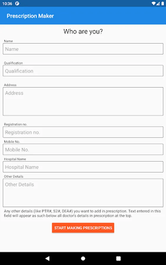 Prescription Maker is a mobile application that helps tireless doctors generate customized prescriptions for their patients. It is an offline prescription maker, with no requirement for an internet connection to write prescriptions. It provides plenty of convenience for doctors by simplifying the process of prescription writing. With an intuitive and user-friendly interface, doctors can create a well-rounded prescription in a matter of minutes. It eliminates the time-consuming process of writing on paper to prescribe medicines to patients. Furthermore, it also helps in cutting down the use of paper. We aim to provide doctors with a mobile application that can make their day-to-day operations more effective and efficient.