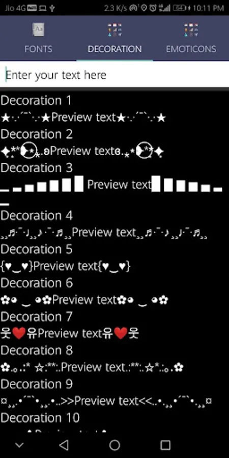 It's really easy to get some awesome text by clicking generate button after downloading this stylish text app for WhatsApp for free. For this just open the main page. On the home page and on the first page, you can see a stylish text generator. Input your text in the box and click generate. Hurrah! Lots of cool text will be there. There is some option to share, copy and make it a favorite. Sharing options include sharing directly to some major social media or other apps.