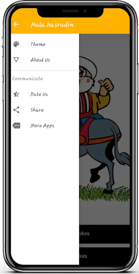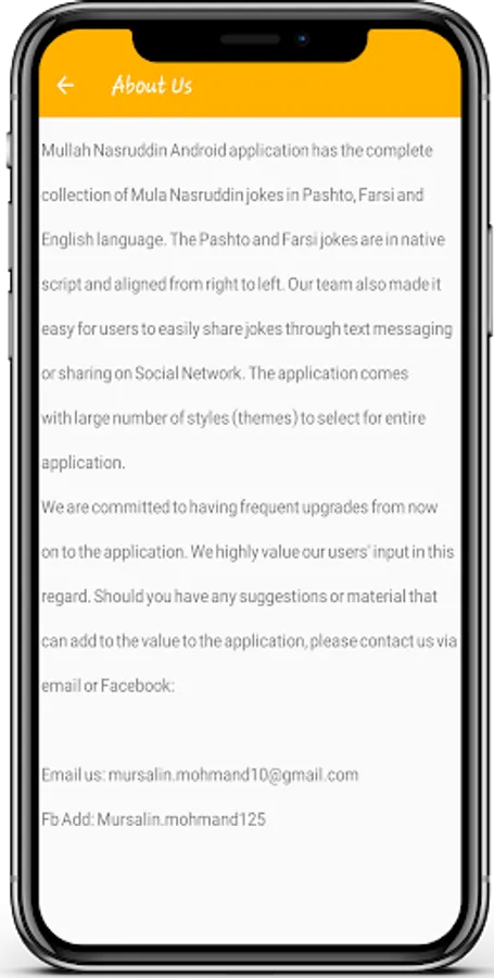 Mullah Nasruddin Android application has the complete collection of Mula Nasruddin jokes in Pashto, Farsi language. The Pashto and Farsi jokes are in native script and aligned from right to left. Our team also made it easy for users to easily share jokes through text messaging or sharing on Social Network. The application comes with large number of styles (themes) to select for entire application.