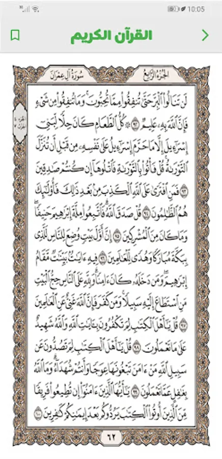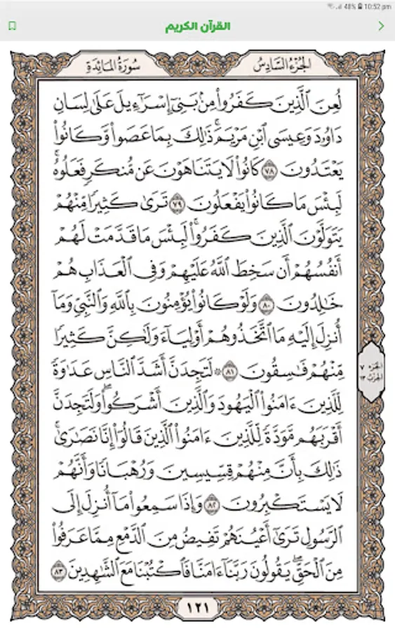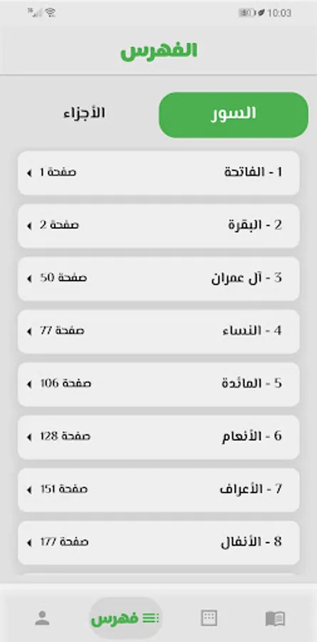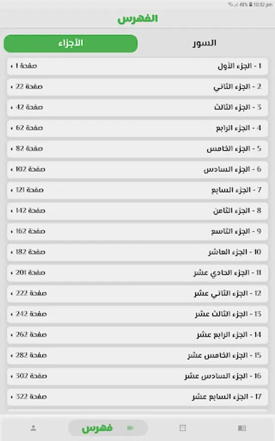 • Index where the Holy Qur'an is divided according to the surahs and parts