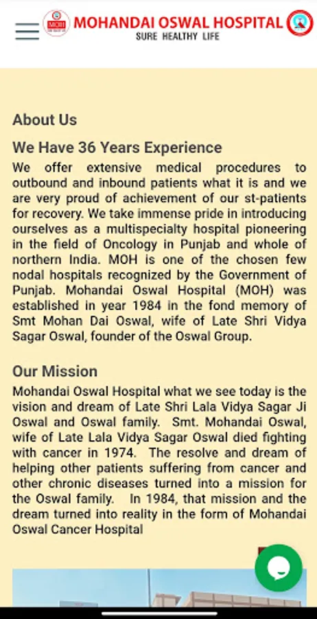 For more than seven decades the Mohandai Oswal Hospital (MOH) has been serving people from all walks of life with exceptional healthcare. MOH is NABH accredited . It is one of the chosen few nodal hospitals recognize by the Government of Punjab. MOH was established in year 1984 in the fond memory of Smt Mohan Dai Oswal, wife of Late Shri Vidya Sagar Oswal, founder of the Oswal Group. It was initially started to provide an affordable cancer treatment to the patients of this region and within two years it established itself as the best oncological institute in northern India. We are not only serving people from the city of Ludhiana but also across the country and beyond the shores.