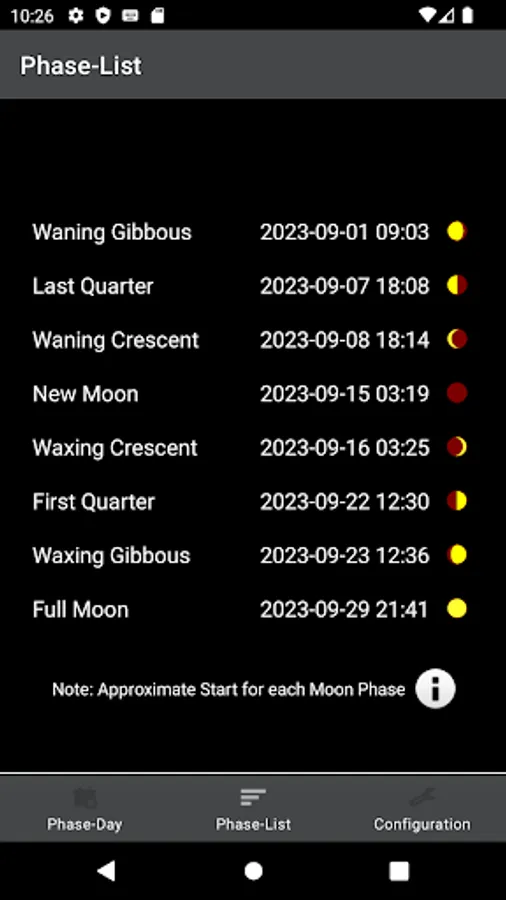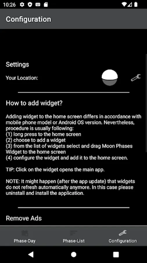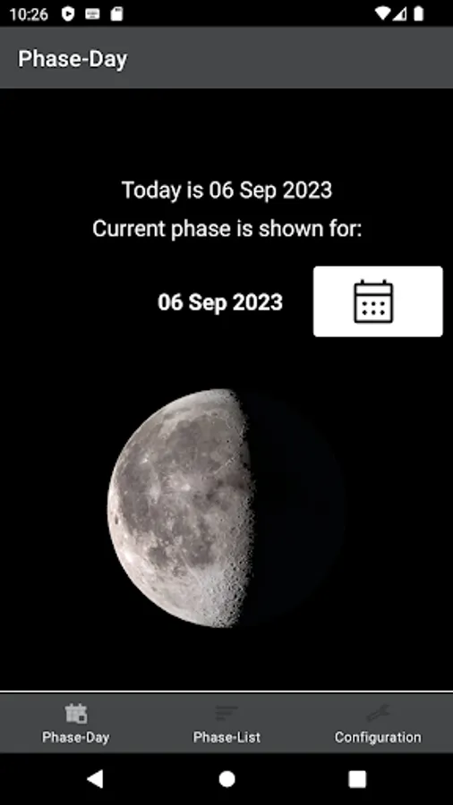 App shows approximate moon phase for current or any selected date. Main purpose of the app is to use widget on your home screen. Widget can only show moon phase for today.