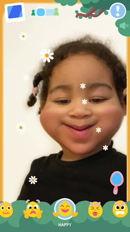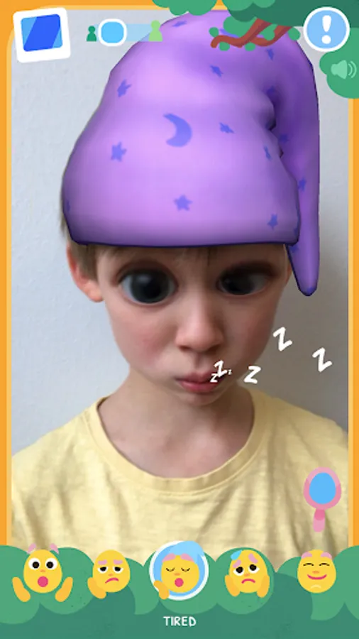 By tapping on the emoticons in the app, representing 19 different emotions, the image of the child’s face will change accordingly. The face becomes e.g. sad, surprised, angry, or happy. There are different emotional filters and sound effects to support the emotion.