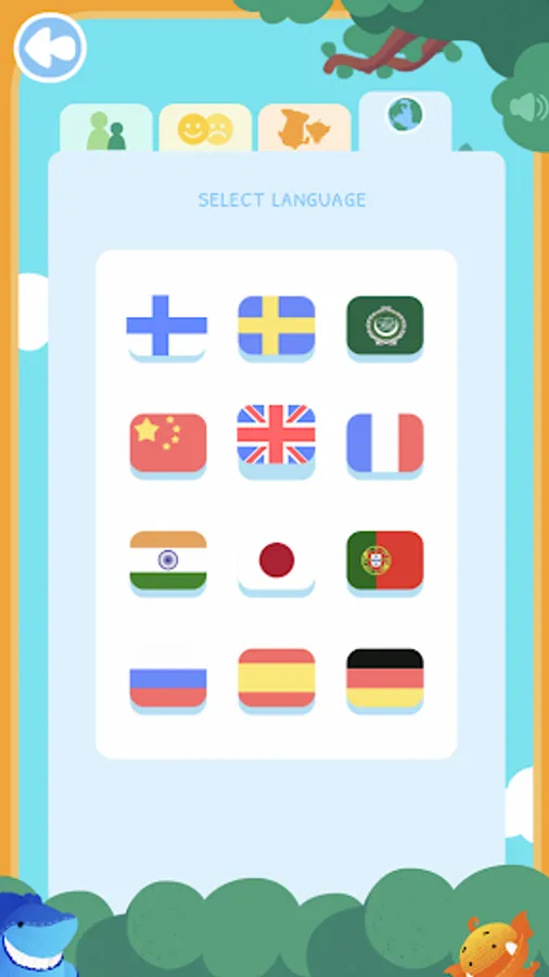 Select your language in the app (English, Spanish, German, French, Portuguese, Russian, Arabic, Mandarin, Japanese, Hindi, Swedish, and Finnish). There are also picture cards with Moka Mera, the little monster, representing the same 19 emotions.