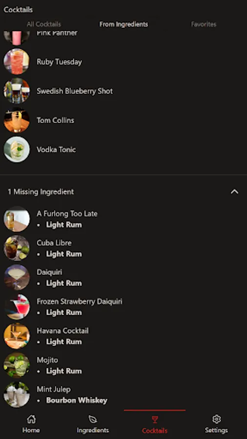 - 1 missing ingredient list. So you can easily pick up that last item and make a new cocktail.