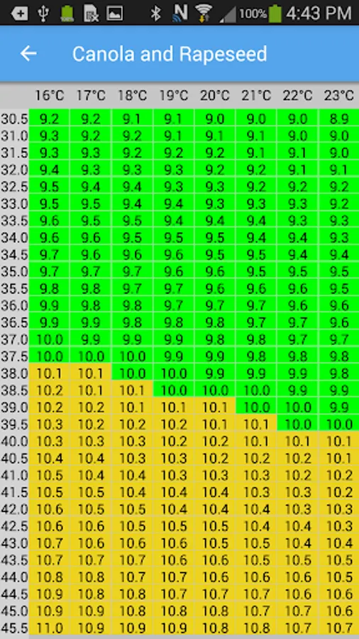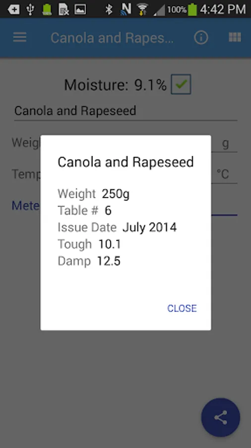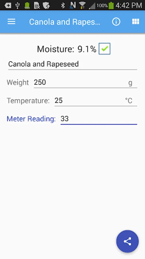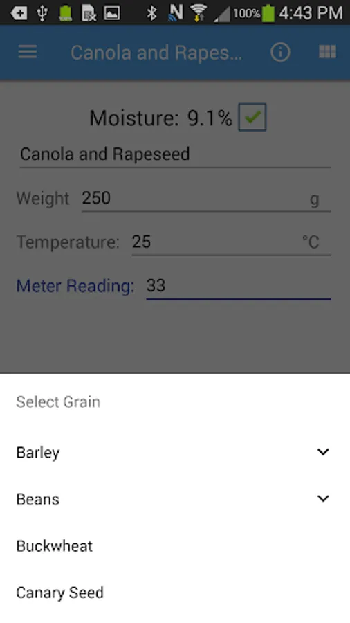 When using a 919 moisture tester to find the moisture content of your grain instead of pouring through mountains of charts simply enter the measured values into this app. Select the grain type and input the temperature and dial meter reading from your 919 moisture tester and the moisture content will be displayed to you. The app will also display to you whether your grain is considered dry, tough, or wet based on the specifications set out by the Canadian Grain Commission.