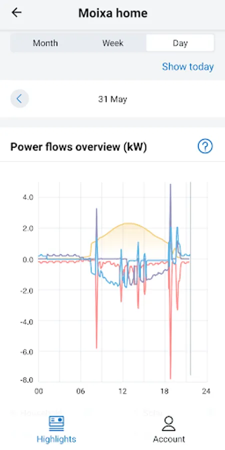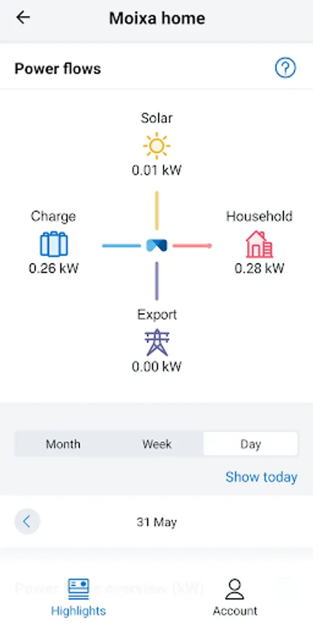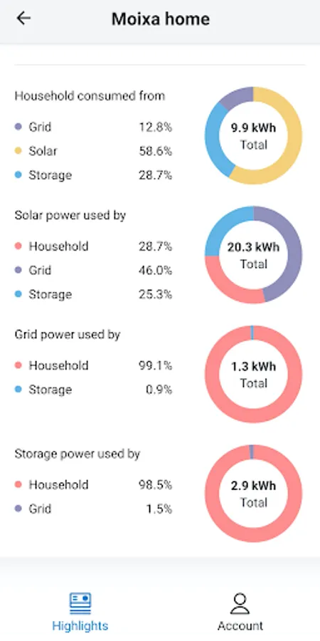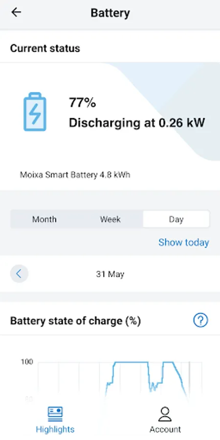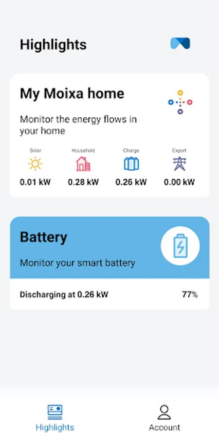 - view the status of your Moixa-connected home and battery on the Highlights tab