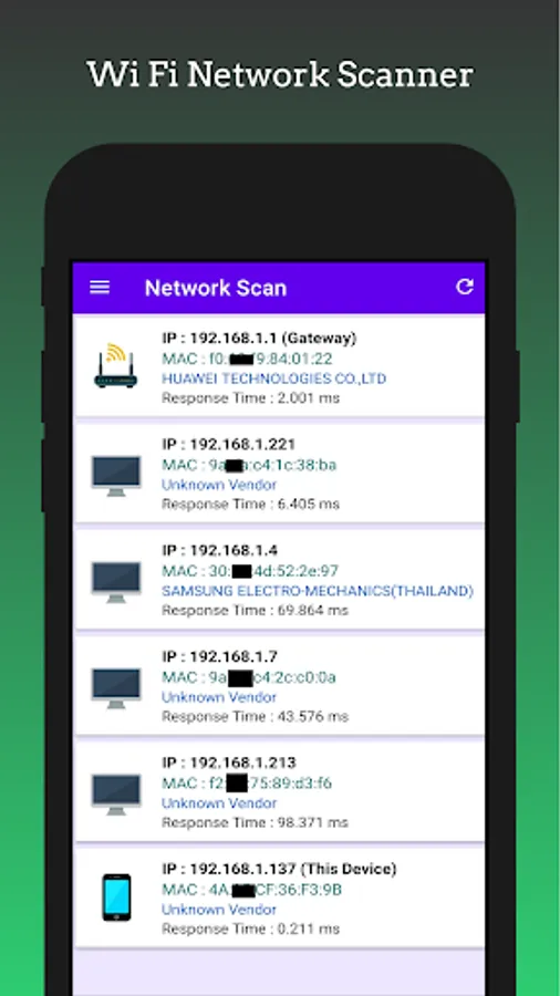 WiFi Network Scanner Scan your Local Network and the list of Network Device like Mobile, Tablets, TV etc with their MAC or Physical Address.