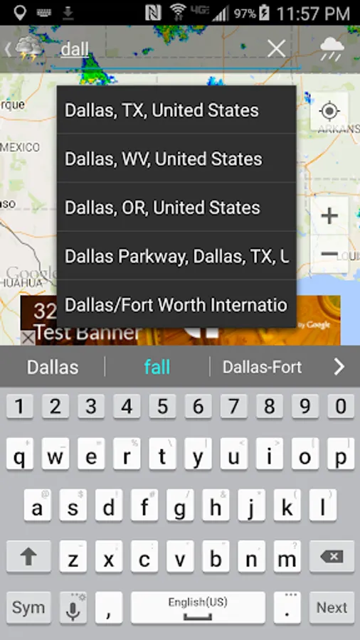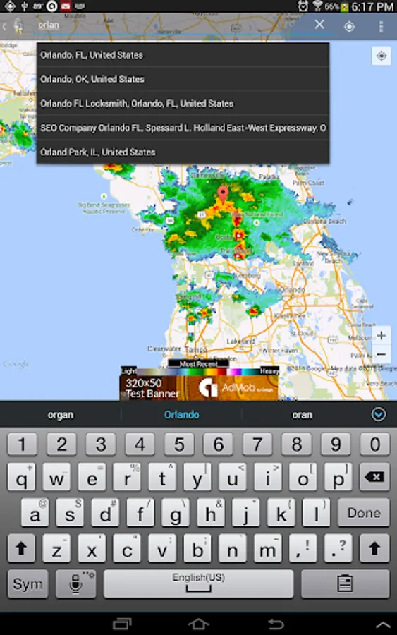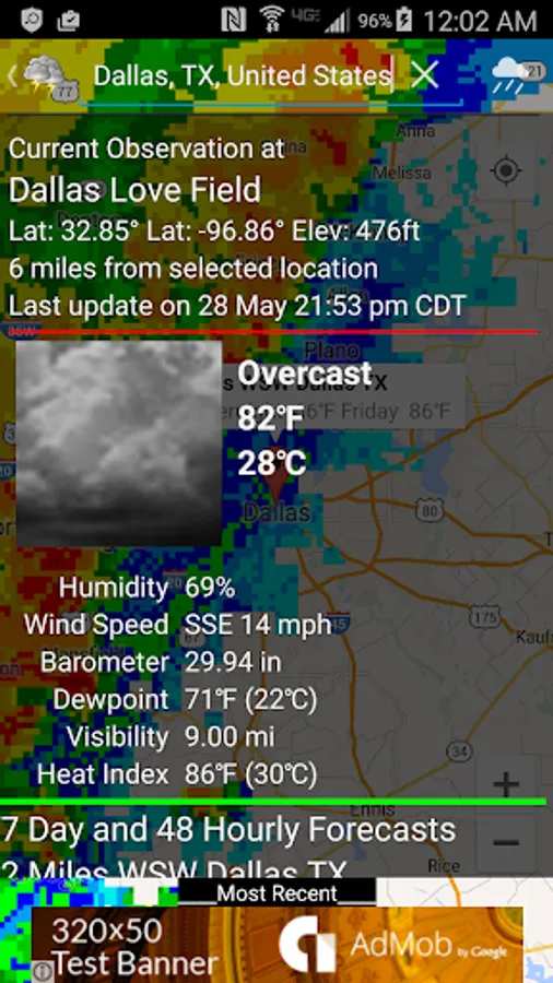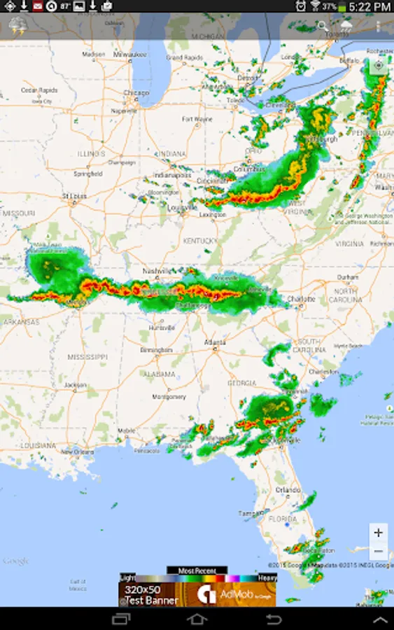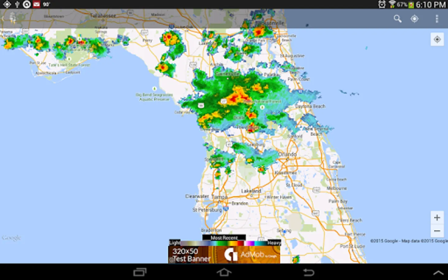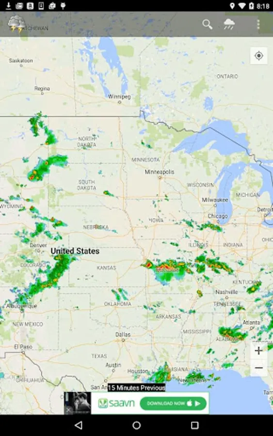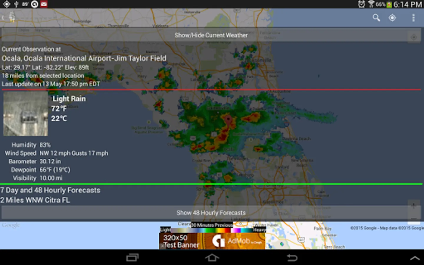 Get NOAA NEXRAD weather radar and forecast for your USA location by tapping the my location icon or any other location in USA by long-pressing on map or typing in a place search on action bar.
