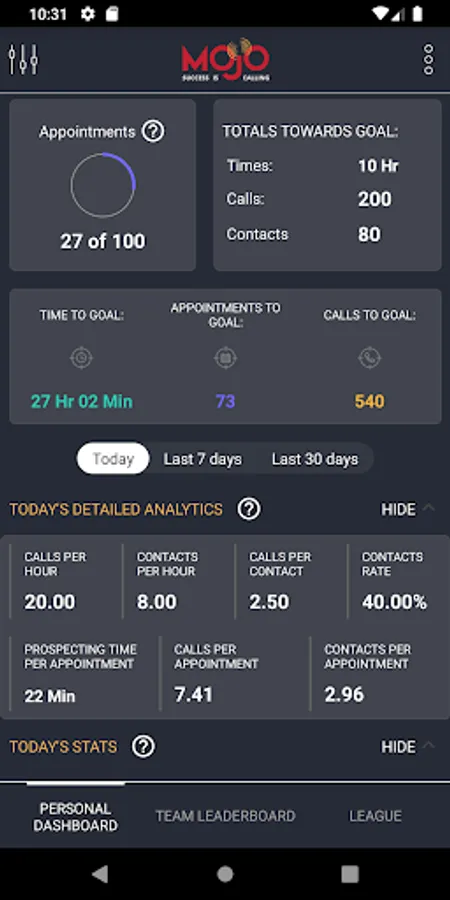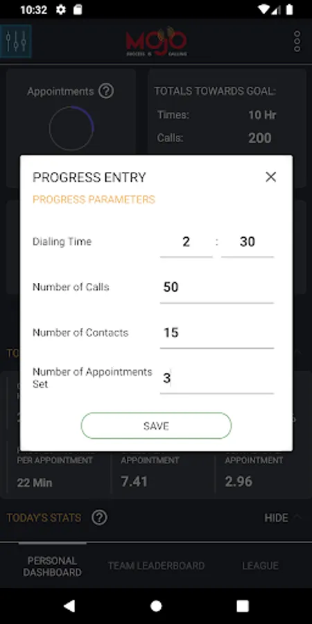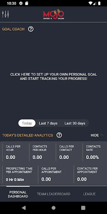 Once your goals are set, simply update the app with your prospecting progress every time you hit the phones. The app will automatically compare your current trajectory against your goals and give you an output of whether you are on or off track.