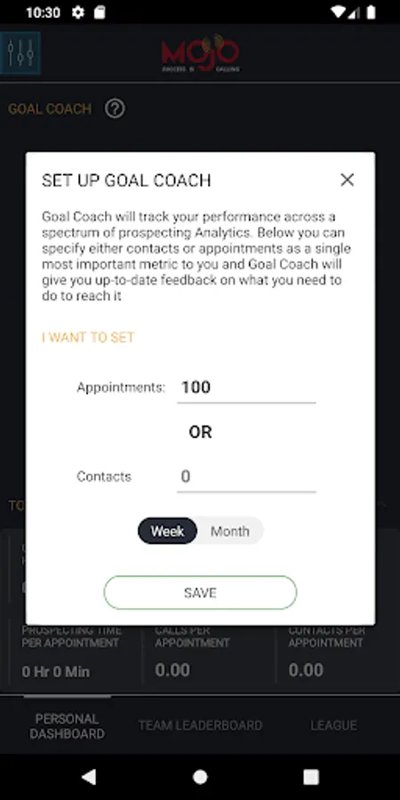 The Prospecting Dashboard app is an easy to use prospecting tool to help you with tracking your personal and team's prospecting goals. Simply enter how many appointments you want to set and how many contacts and calls you want to make by week or month and you're done!