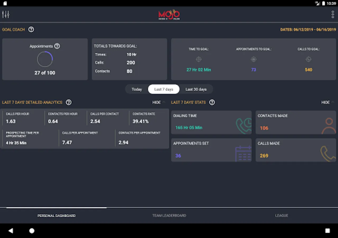 Prospecting Dashboard connects seamlessly with the Mojo Dialer and all progress using Mojo is automatically updated in the app.