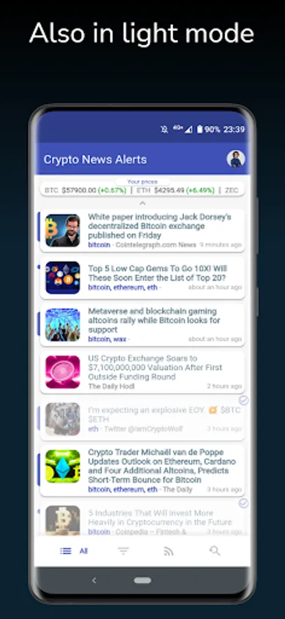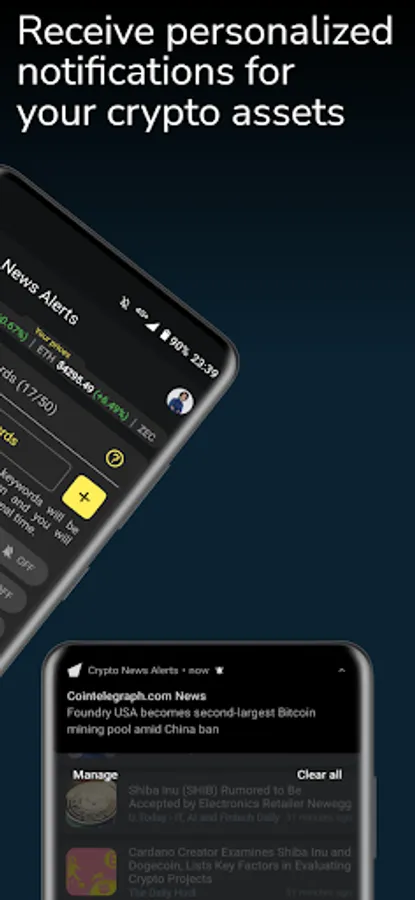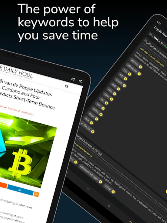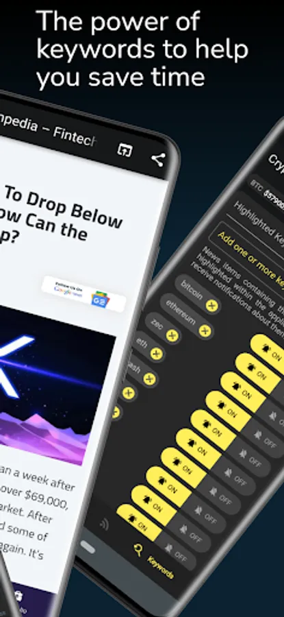 By simply defining some keywords you will save time searching for news of your interest. You will receive the news as a notification without opening the app. You will receive real time cryptocurrency news for any altcoin or expression you define as keyword.