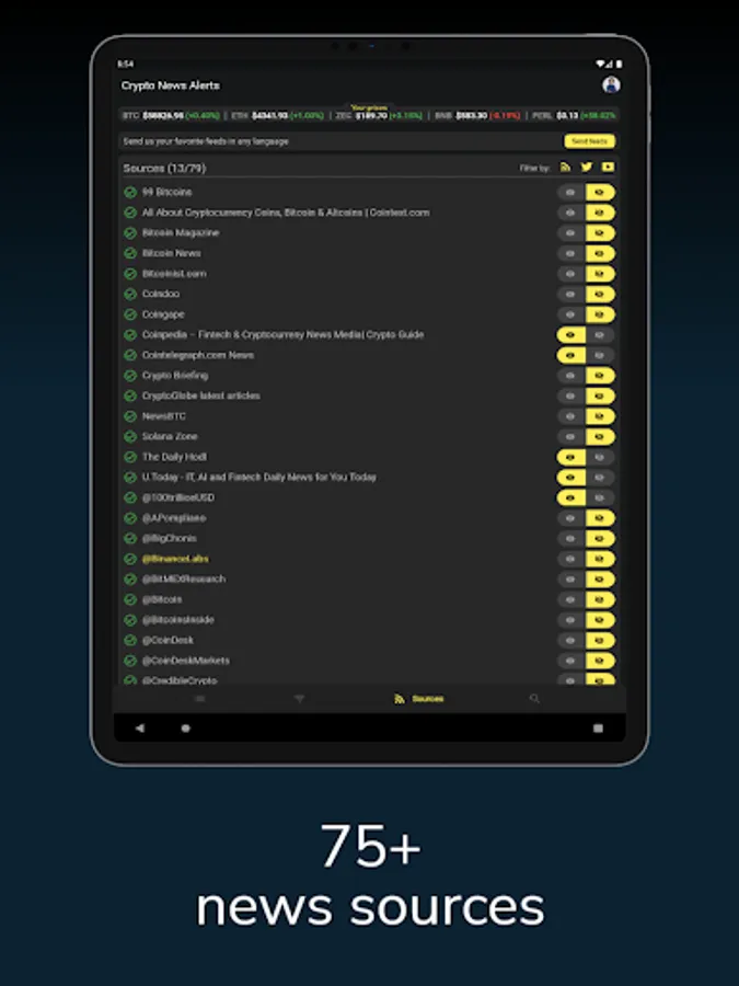More than 75 different data sources, including websites, analysts and twitter influencers or youtube channels related to cryptocurrency market.