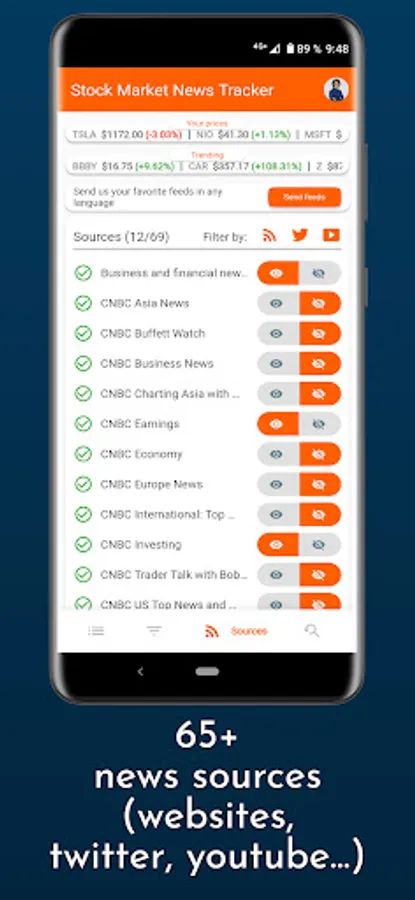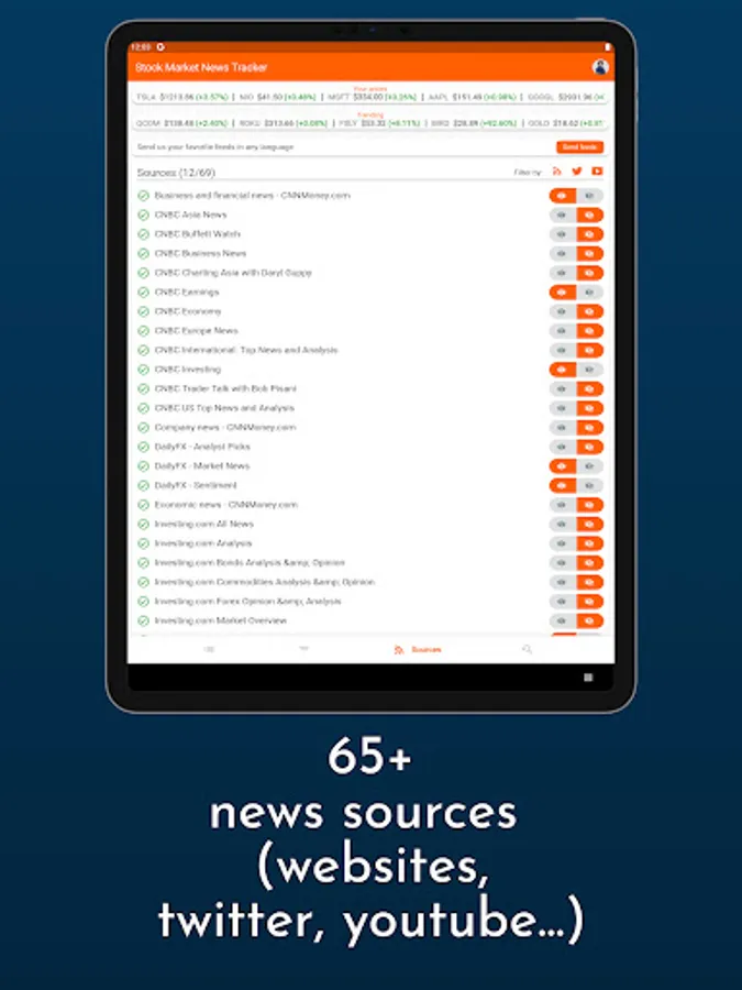 More than 65 different data sources, including websites, analysts, influencers from twitter and youtube channels related to financial market. The twitter sources are from news websites and important analysts of the stock market sector.