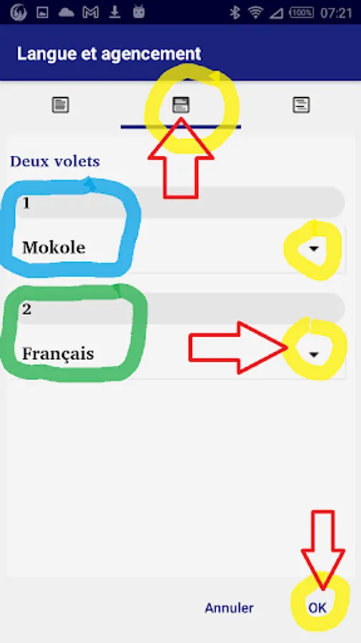 - "two panes" to display the Mokole at the top and the French or English version at the bottom
