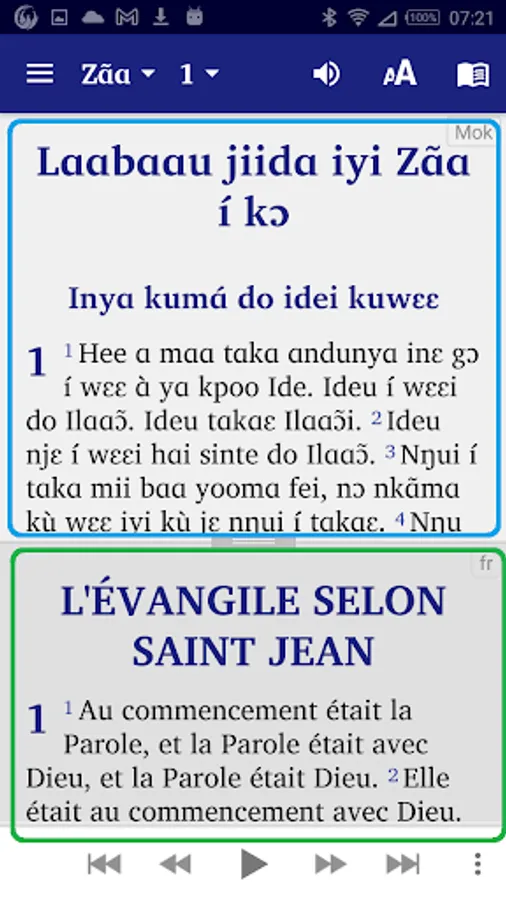 - "verse by verse" to display a verse in Mokole followed by the same verse in French or in English.