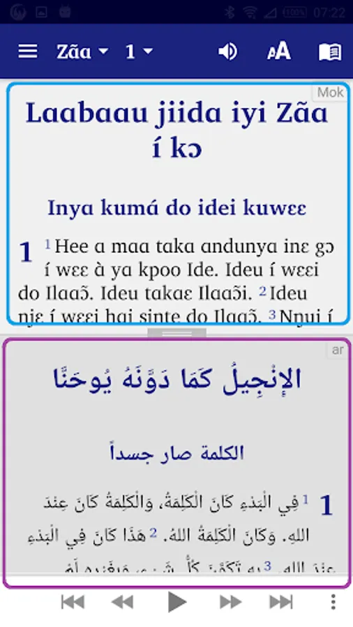 - "verse by verse" to display a verse in Mokole followed by the same verse in French or English.