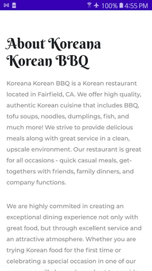 Koreana Korean BBQ is a Korean restaurant located in Fairfield, CA. We offer high quality, authentic Korean cuisine that includes BBQ, tofu soups, noodles, dumplings, fish, and much more! We strive to provide delicious meals along with great service in a clean, upscale environment. Our restaurant is great for all occasions - quick casual meals, get-togethers with friends, family dinners, and company functions.