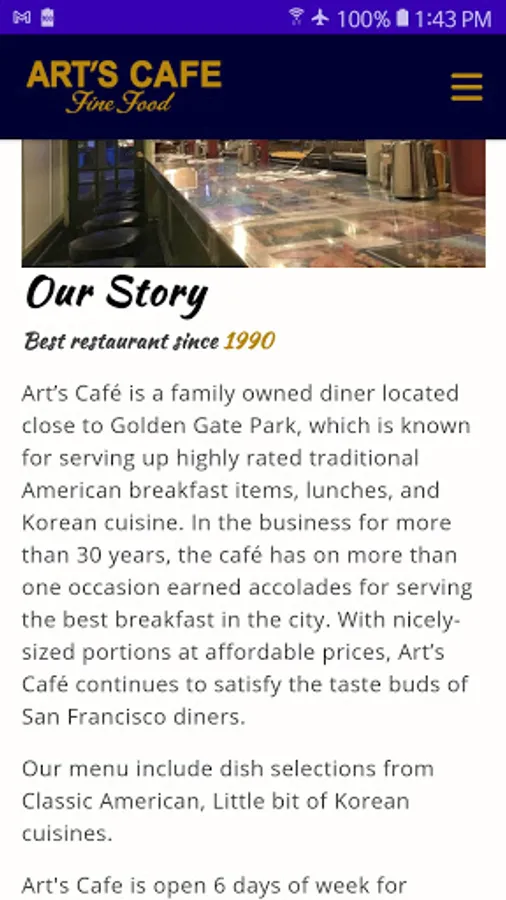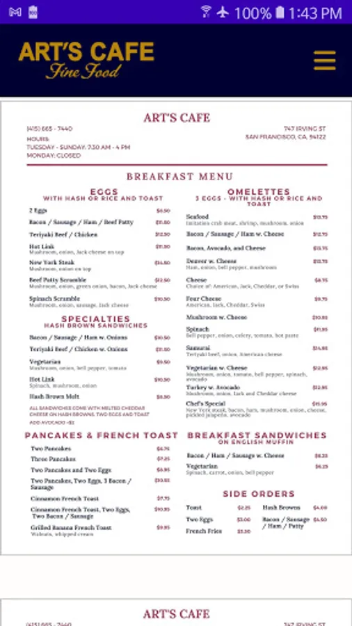 Art’s Café is a family owned diner located close to Golden Gate Park, which is known for serving up highly rated traditional American breakfast items, lunches, and Korean cuisine. In the business for more than 30 years, the café has on more than one occasion earned accolades for serving the best breakfast in the city. With nicely-sized portions at affordable prices, Art’s Café continues to satisfy the taste buds of San Francisco diners.