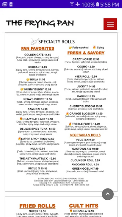 The Frying Pan is a delicious and satisfying staple of Asian / Fusion cuisine. Enjoyed with our sushi, rolls and and delicious other Asian appetizers and others. Our Tempura, Udon is sure to warm your stomach and soul.