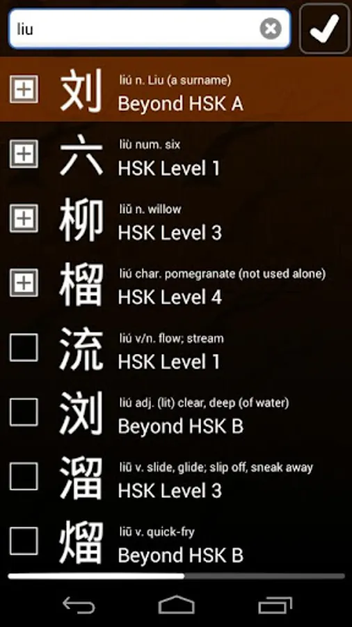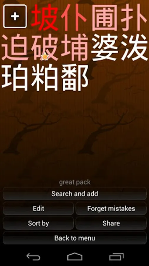 ✓ Create your own packs by searching for characters by Pinyin. You can even mix Pinyin, English and Chinese characters in one search to find as many results as possible, and one tap adds them all to your custom pack.