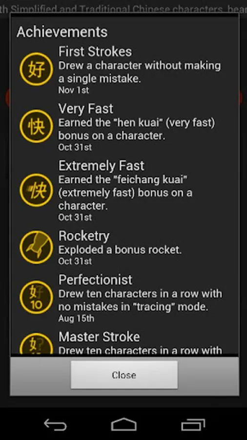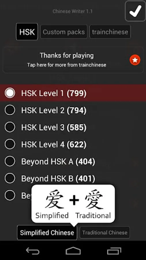 ✓ The app remembers which characters you've had trouble writing and prioritises them in future games, as well as highlighting them in the character pack browsing screen.