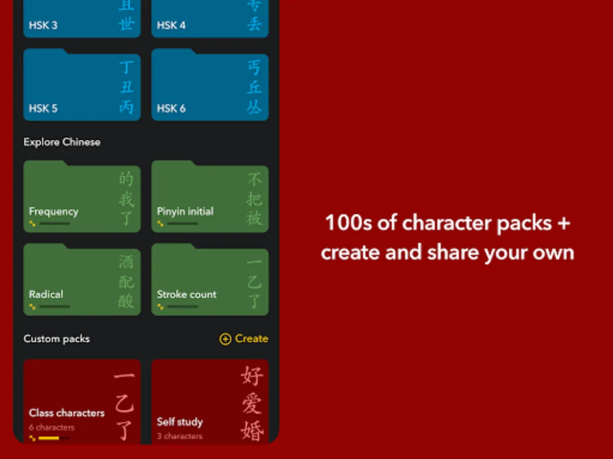 ✓ Create your own packs by searching for characters by Pinyin. You can even mix Pinyin, English and Chinese characters in one search to find as many results as possible, and one tap adds them all to your custom pack.