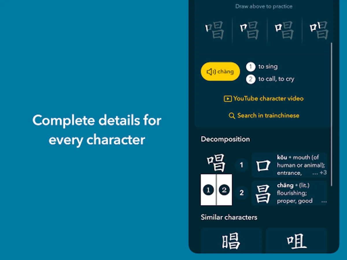 ✓ trainchinese Chinese Writer can test you on more than 5,000 Simplified and Traditional Chinese characters, and features stroke-order diagrams, English explanations and high quality audio recordings for every pronunciation of each one.