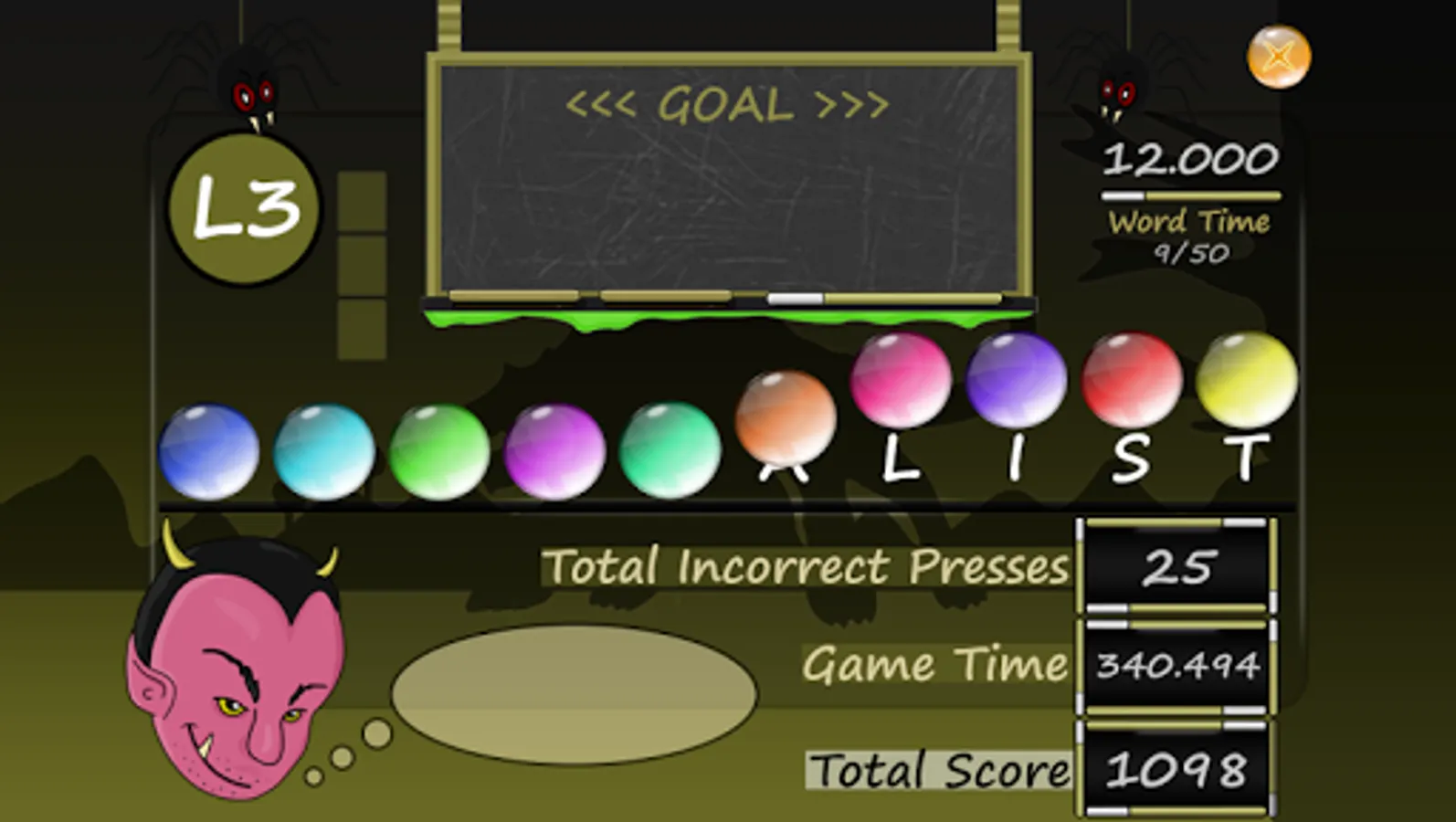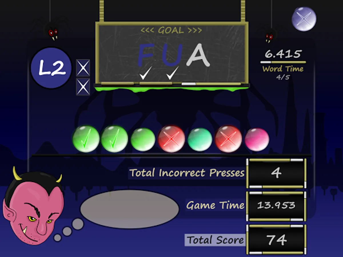 The aim of the game is to memorize where the goal letters are and reveal them as quickly as possible by tapping the screen. You will need to be super fast because the time ticks away very quickly! Before you know it you will only have milliseconds left before your time is up - You are against the clock for every word!