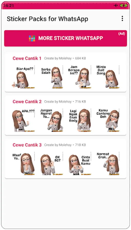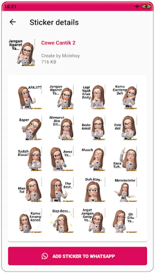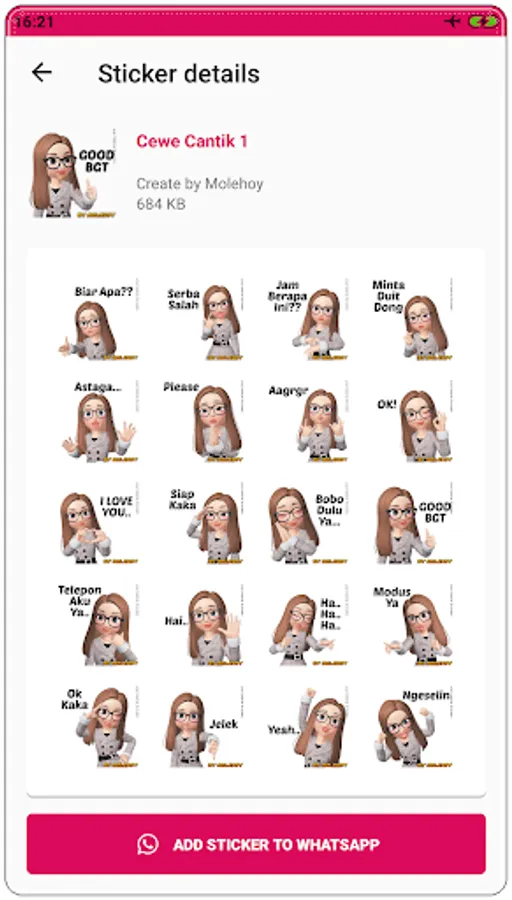 Hi Guys.. Besides Sundanese Stickers, Betawi Stickers and Ngapak Stickers that are present on the PlayStore, this time Molehoy re-launched WA stickers for whatsapp Indonesia entitled Women's Beautiful Romantic Stickers WAStickerApps. Curious about what funny stickers are in it??, Come on, let's have a collection of the newest and best WA stickers that will certainly be fun when used for chatting.