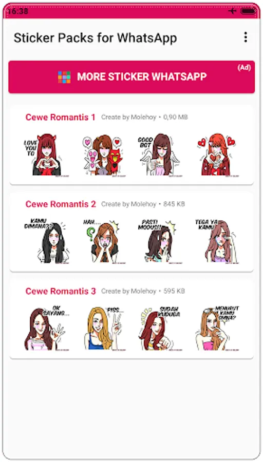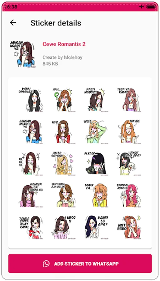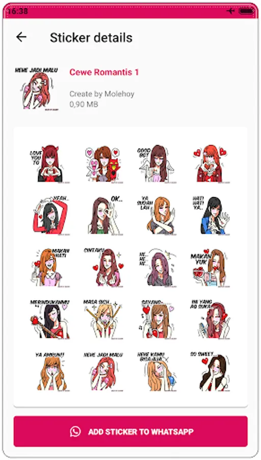 Hi Guys .. Besides Sundanese Stickers, Betawi Stickers and Ngapak Stickers Present at PlayStore, this time Molehoy re-launched WA stickers for whatsapp Indonesia entitled WAStickerApps Romantic Girl Stickers . Curious about any funny stickers in it ??, Let's immediately have a collection of the latest and best WA stickers that are sure to be fun when used chatting.