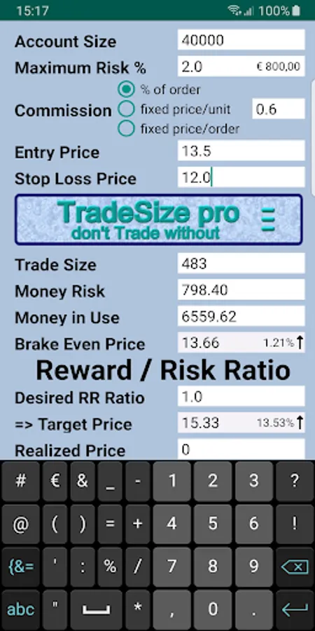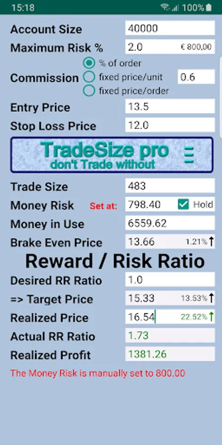 If the Money Risk or the Money in Use is getting too large, TradeSize pro can be set as desired. Set or hold the Trade Size, maximize the Money Risk or maximize the Money in Use, set your desired Reward Risk Ratio and the expected or actual Realized selling Price.