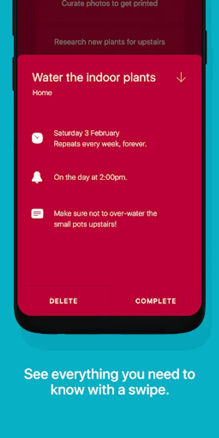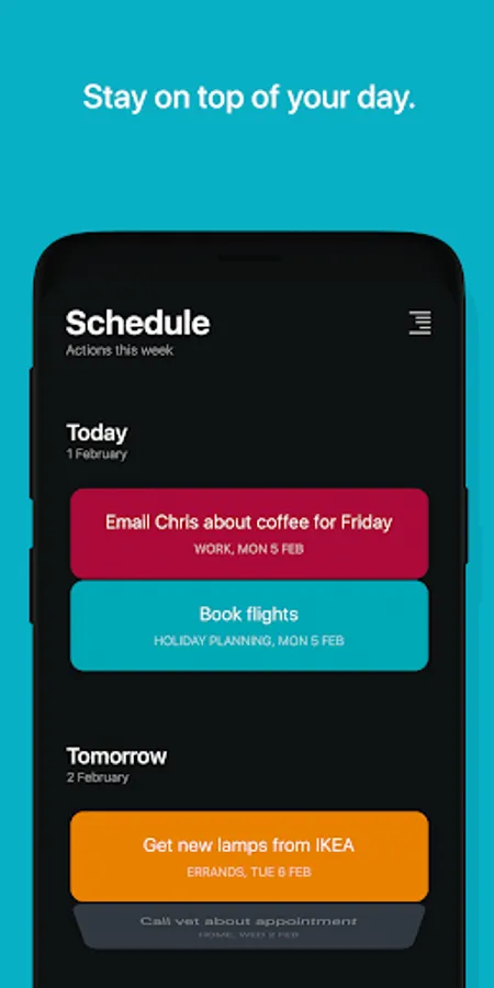 With Action Cards you can create tasks that drop directly into your easy-to-see schedule. Pair them with reminders, notes, and lists to effortlessly organize your day.